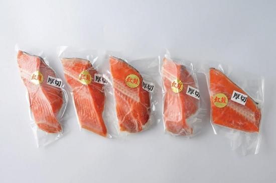 紅鮭を3〜4cmに厚切りにし、1切れずつ当店で真空しました。便利な1切真空なので食べる分だけ解凍し焼くだけの手軽さが人気です。1切れで食べ応えがある美味しい紅鮭です。※身・尾お選べできません。