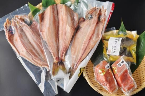 濃厚な味わいの羅臼産「真ほっけ」、北海道産の「根ほっけ」、脂がのった「トロほっけ」の3種のほっけと、絶品と人気の厚切鮭と銀だらのセットです。